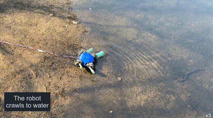 这些变化使机器龟的肢体能够在有利于行走的圆柱形几何形状,和有利于游泳的平鳍几何形状之间来回切换,进行适应性变形。在真正下水测试时,机器龟通过行走和匍匐前进的方式靠近水面,到达水域后,机器龟就将腿变成鳍状肢,使其能够以基于升力和阻力的水上步态进行畅游。