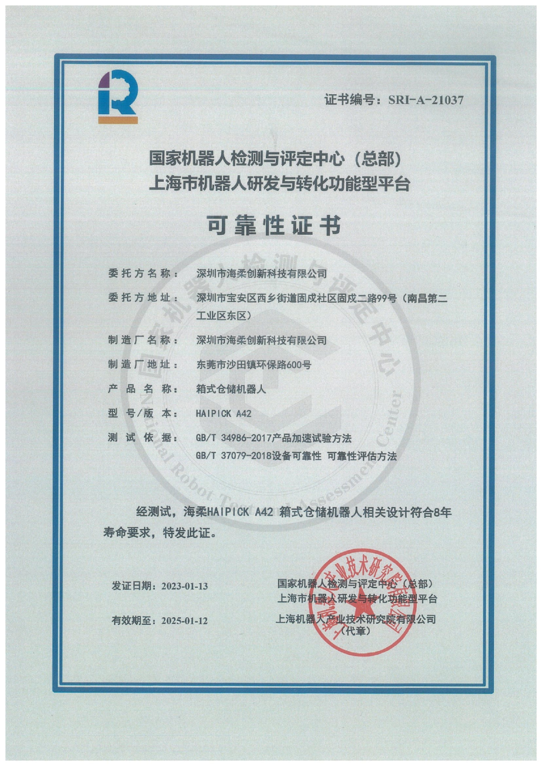 近日,深圳市海柔创新科技有限公司(以下简称“海柔创新”)的A42 箱式仓储机器人再获由国家机器人检测与评定中心(总部)颁发的可靠性证书,这是继去年获得MTBF测评证书基础上的再次突破。