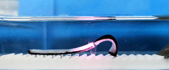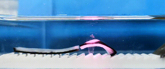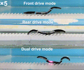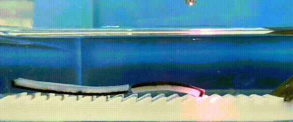 当红外光移动到机器人尾部时,对称相反的结构使得尾部凝胶向上弯曲从而抬起头部,与基底的卯榫结构打开,解除锚定。