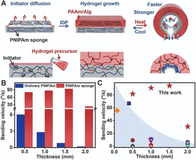 而外层的水凝胶是通过界面扩散聚合(IDP)策略在“海绵”表面被动生长的,它能够很牢固地固定在“海绵”上。这样一来,复合水凝胶能够快速响应外部温度变化,从而快速弯曲变形。