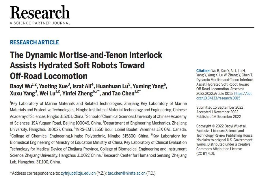 论文标题为“The Dynamic Mortise-and-Tenon Interlock Assists Hydrated Soft Robots Toward Off-Road Locomotion”。DOI: org/10.34133/research.0015